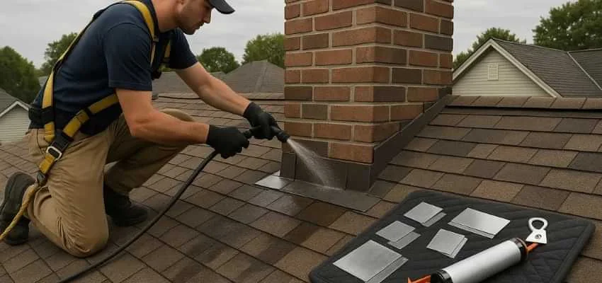 We examine crown slope, cap fit, mortar joints, brick or stone surfaces, and flashing transitions at the roofline. In Latera, Carrollton this area is often the origin of leaks.